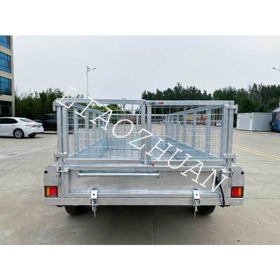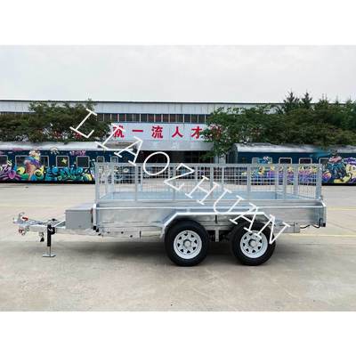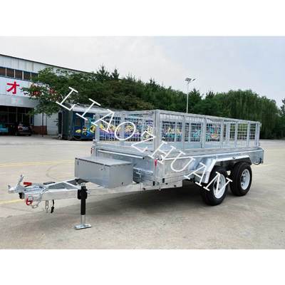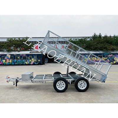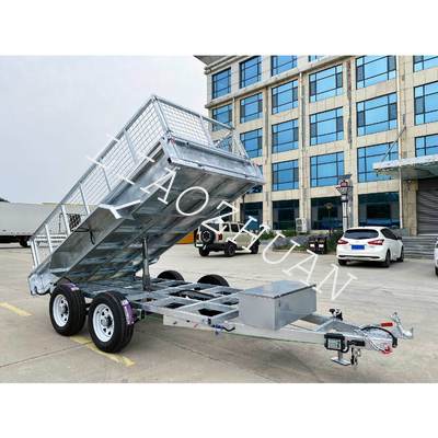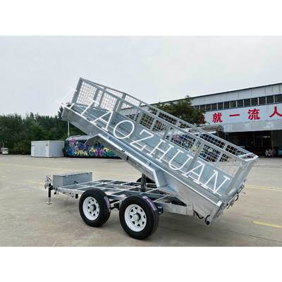 Key features include high-strength hydraulic cylinders with hydraulic power components, dual 12′′ electric drum brakes, 50mm square solid axles, and 8-leaf leaf springs for enhanced stability and smooth traction. The trailer also features 1500mm tie rods, a lattice floor, removable front and rear doors, tie rods, and a steel toolbox. Optional 600mm/900mm removable cages are available. With internal dimensions of 3650mm x 2100mm x 300mm, it is ideal for construction, agriculture, and landscaping tasks.