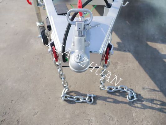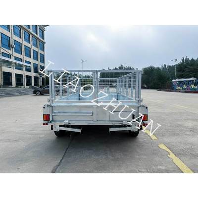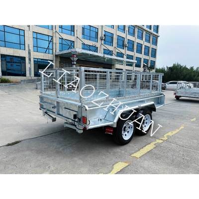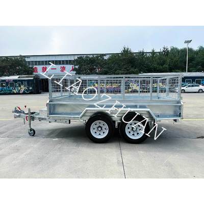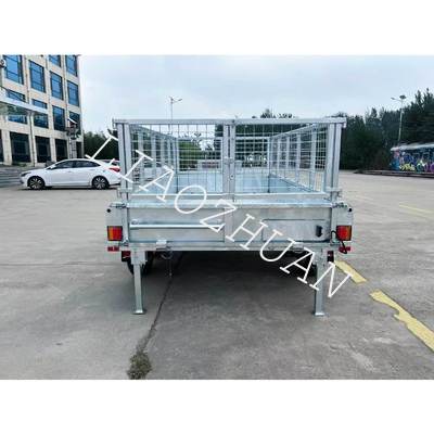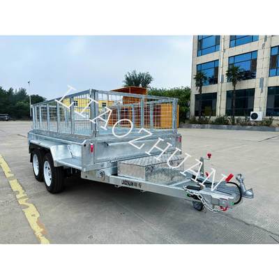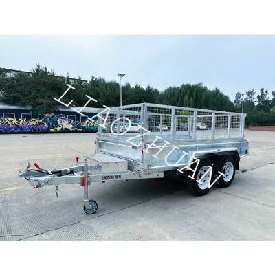 Key features include high-strength hydraulic cylinders with hydraulic power components, dual 12′′ electric drum brakes, 50mm square solid axles, and 8-leaf leaf springs for enhanced stability and smooth traction. The trailer also features 1500mm tie rods, a lattice floor, removable front and rear doors, tie rods, and a steel toolbox. Optional 600mm/900mm removable cages are available. With internal dimensions of 3040mm x 1530mm x 300mm, it is ideal for construction, agriculture, and landscaping tasks.